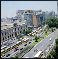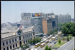 En la fotografía se ve también un conjunto de edificios aledaños, vehículos y transeúntes. Avenida Libertador Bernardo O'higgins, entre calles San Diego y Avenida Bulnes; vista aérea.