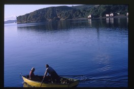En la fotografía se ve a dos pescadores artesanales en el lago