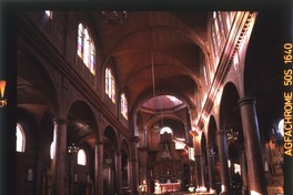 Al interior de la iglesia se pueden apreciar naves con bóvedas de crucería separadas por columnas y arcos de medio punto y ventanas con vitrales.