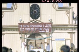 En la parte superior de la puerta principal hay un pendón que dice: Con María descubramos a Jesús hijo único del eterno Padre Tirana 81.