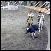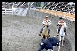 En la fotografía dos huasos a caballo arrean un novillo bordeando la medialuna.