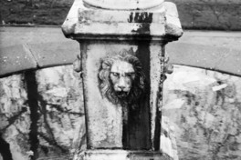 Fotografía parcial de una fuente de agua y su parte central que consiste en un pilar con formas de cabezas de leones esculpidas.