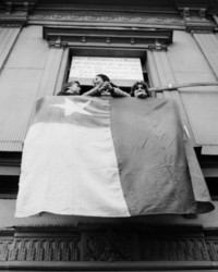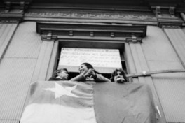 [Edificio de barrio cívico de Santiago: Tres personas en balcón con bandera chilena. Cartel que en las líneas 3 y 4 dice: "... pero el poder de los trabajadores..."] [fotografía] / Tito Vásquez [Santiago : Tito Vásquez , entre 1970 y 1973]. 1 Negativo : monocromo, gelatina sobre acetato de celulosa ; 6 x 6 cm. .