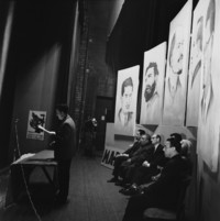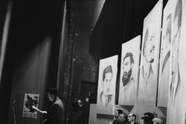 AF0022546_001: Armando Cassigoli, orador; sentados: Pablo de Rokha, su hijo Carlos, Héctor Behm y otros; retratos de Fidel Castro, Vladimir Lenin, Mao Tse-Tung, Patricio Lumumba y otros.