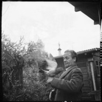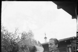 [Nicanor Parra con una paloma, casa de La Reina] [fotografía] Hans Ehrmann.