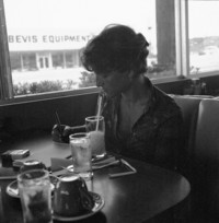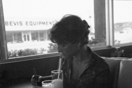 Mujer joven en un restaurant [fotografía] / Hans Ehrmann. California : Hans Ehrmann, [19--]. Negativo : monocromo, gelatina sobre acetato de celulosa ; 35 mm. .