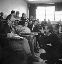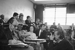 [Fotógrafo retrata grupo de personas que asisten a un congreso] [fotografía] / Hans Ehrmann. [Lugar no identificado] , Hans Erhmann, [1968]. Ercilla (Revista : Chile)-- no. 1725, p. 60 Negativo : monocromo, gelatina sobre acetato de celulosa ; 6 X 6 cm. .