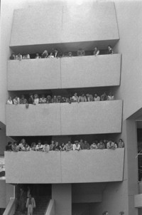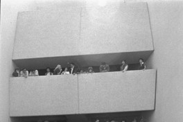 [Grupo de personas reunidas en diferentes pisos de un edificio] [fotografía] Hans Ehrmann.