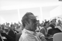 Nicanor Parra en una conferencia [fotografía] Hans Ehrmann.