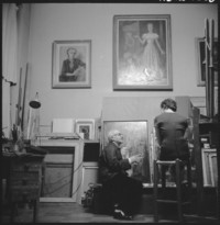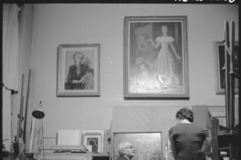 [Camilo Mori, en su taller de pintura; junto a retratos de Maruja Vargas (su esposa) y autorretrato; obra Triángulo, 1941] [fotografía] Hans Ehrmann.