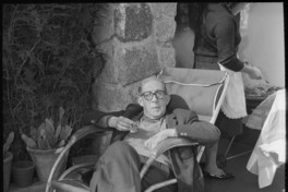 Alberto Romero [sentado en un sillón en el jardín] [fotografía] / Hans Ehrmann. [Chile] : Hans Ehrmann, [ca. 1965]. 2 negativos : monocromo, gelatina sobre acetato de celulosa ; 6 X 6 cm. .