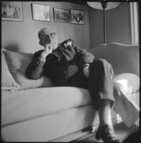 Alberto Romero, [sentado en un sillón del living de su casa] [fotografía] / Hans Ehrmann. [Chile] : Hans Ehrmann, [ca. 1965]. 4 negativos : monocromos, gelatina sobre acetato de celulosa ; 6 X 6 cm. .