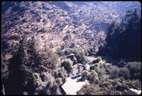 Imágen de la residencia de El Cañaveral, en la precordillera de Santiago de Chile, captada desde un punto elevado. La imagen muestra la casa rodeada de jardines y vegetación, enmarcada por un entorno de cerros y quebradas.