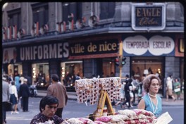 Imágen de un vendedor ambulante en el centro de Santiago, frente a la multitienda Ville de Nice, en la esquina de Ahumada con Huérfanos. El comerciante ofrece maní y dulces desde un carro en forma de barco, conocido popularmente como "barco manicero", un elemento característico del comercio informal urbano de la época. La imagen refleja la convivencia entre el comercio popular y las grandes tiendas del centro capitalino durante la década de 1970.