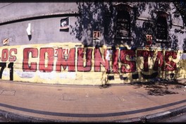 Imagen panorámica de un muro pintado con consignas políticas y propaganda mural, acompañado de afiches de campaña electoral. En el mensaje destacan alusiones al Partido Comunista y al MUPT 71. La toma evidencia la utilización del espacio urbano como soporte de expresión política durante el período.