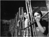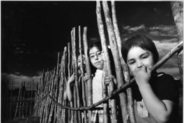 En la fotografía se observa a tres niños detrás de una reja de madera.