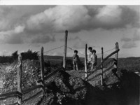 Fotografía en blanco y negro que muestra a tres niños pequeños detrás de una cerca de madera y alambre de púas. Se encuentran sobre suelo de tierra, en un entorno natural con arbustos y, al fondo, lo que parece ser un río bajo un cielo nuboso.