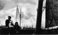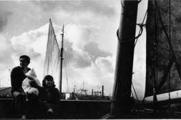 Fotografía que muestra a un grupo familiar compuesto por un hombre, una mujer y un niño, sobre una embarcación a vela. La escena retrata una familia chilota en su entorno marítimo, destacando la relación con el mar como parte de su vida cotidiana.
