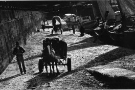 Fotografía del puerto de Angelmó. En primer plano se observa una carreta tirada por un caballo y, más atrás, otra carreta en la misma dirección. Al costado se aprecia un conjunto de embarcaciones varadas en la orilla.