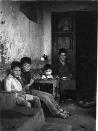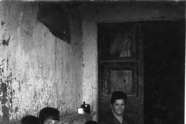 Retrato grupal que muestra a una persona adulta y tres niños en el interior de una vivienda. El niño más pequeño se encuentra dentro de un pequeño corral de madera. La persona adulta podría ser la madre o la abuela.