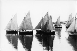Fotografía que muestra cuatro embarcaciones a vela flotando sobre el mar de Angelmó.