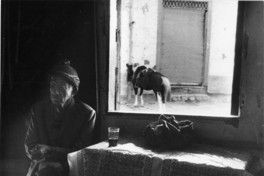 En la fotografía se observa a un hombre sentado en el interior de un espacio que parece una vivienda o un bar; a su lado hay una mesa con un vaso medio lleno, y detrás de ella se ve una ventana a través de la cual se distingue un caballo en el exterior.