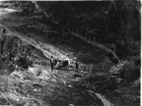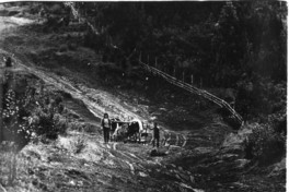 Imagen que muestra una yunta de bueyes descendiendo por una cuesta, acompañada por una mujer y un joven.