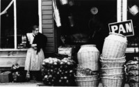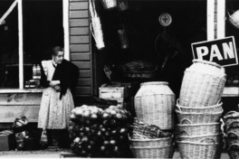 Fotografía que muestra a una mujer mayor al exterior de un puesto de venta de víveres y artesanía en Angelmó. En la imagen se observan sacos con verduras, canastos de mimbre y un cartel con la palabra "Pan".