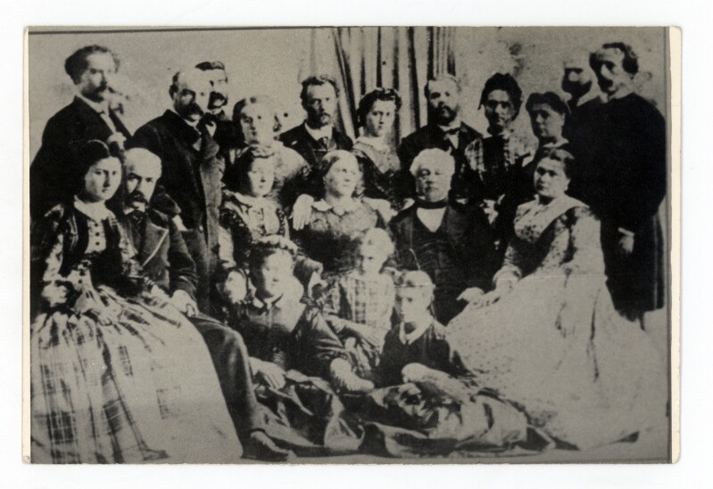 [Retrato de la familia Vicuña Mackenna; sentados, de izquierda a derecha: Lutgarda Vicuña de Zañartu, Benjamín Vicuña Mackenna, Josefa Vicuña de Portales, Carmen Mackenna de Vicuña, Pedro Félix Vicuña y Aguirre, Dolores Vicuña de Morandé; de pie, de izquierda a derecha: Hermenegildo y Bernardo Vicuña, Ponciano Dávila, Luisa Vicuña de Dávila, Juan Vicuña, Carmen Vicuña de Vicuña, Eladio Vicuña, Manuela Subercaseaux de Vicuña, Gertrudis Vicuña, Nem...