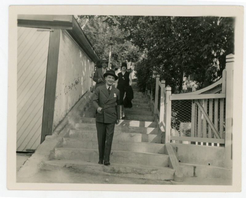 José Ureta Valdés, bajando una escala; atrás, su señora, Adelina Casanova Vicuña; balneario de Zapallar [fotografía].