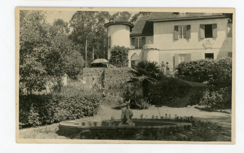 Zapallar: Castillo Casanova, años 50; en primer plano, la pila del ganso, réplica en yeso (perdida), atrás, en puente levadizo, cañon colonial (robado) [fotografía].