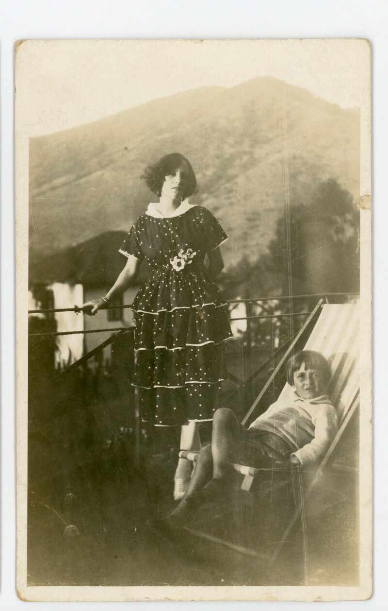 19 II 1919 [Terraza del Castillo Casanova: León Prieto Casanova junto a su madre, Magdalena Casanova de Prieto; detrás, se observa el gasómetro que sustenta de luz la casa], [fotografía]