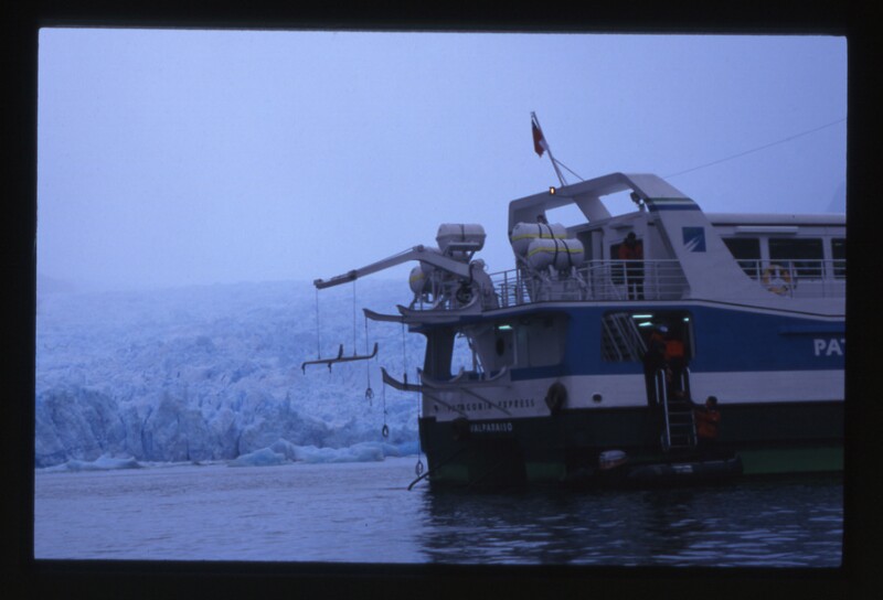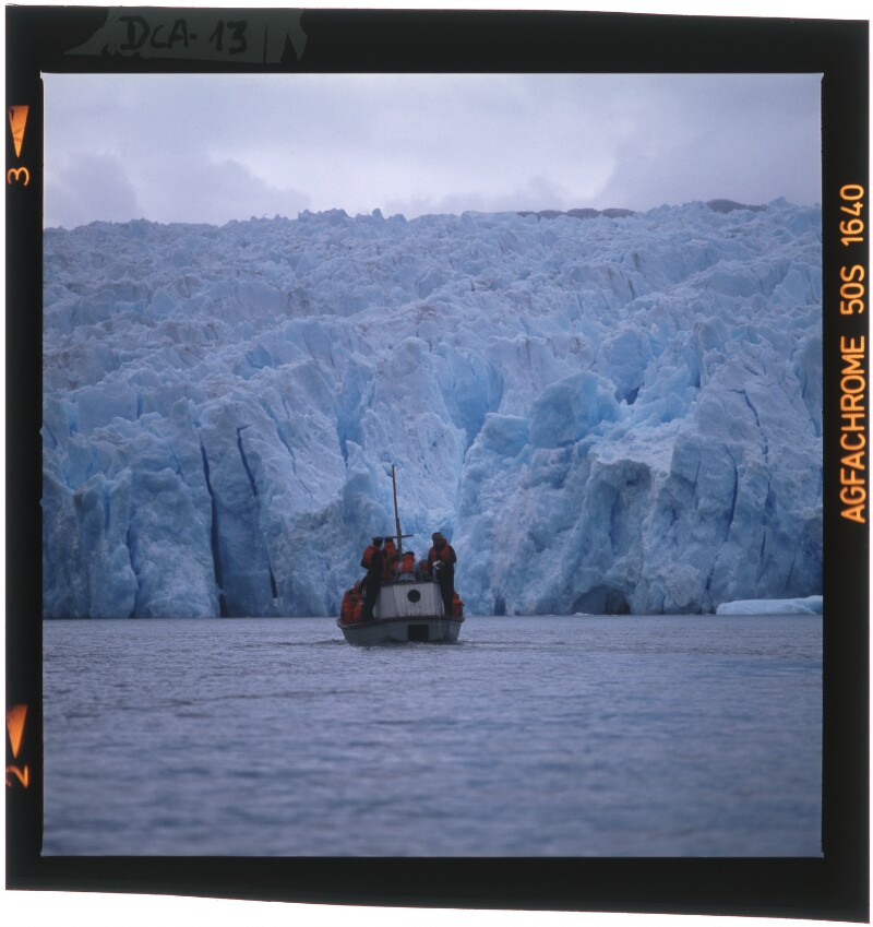 [Turistas de excursión en un bote recorriendo glaciares] [fotografía] Jack Ceitelis.