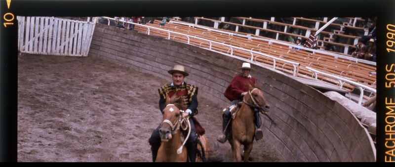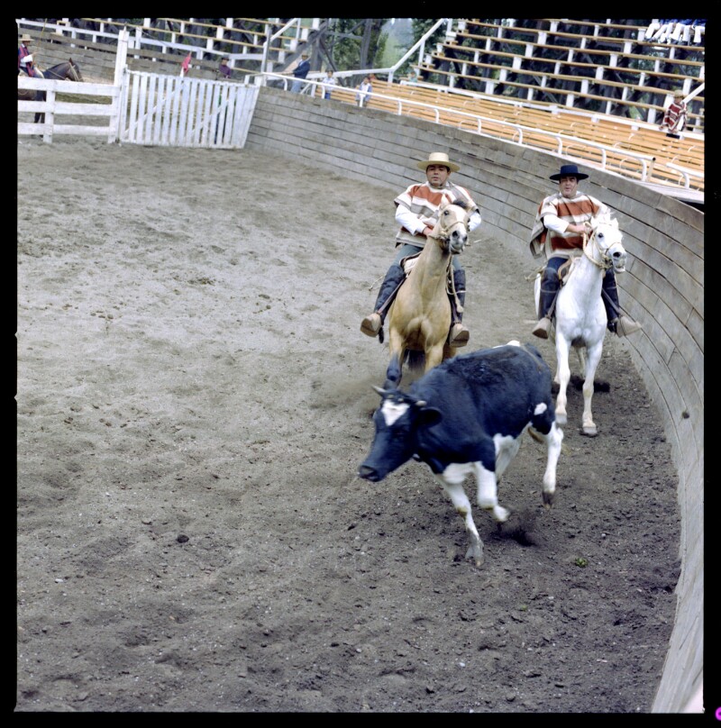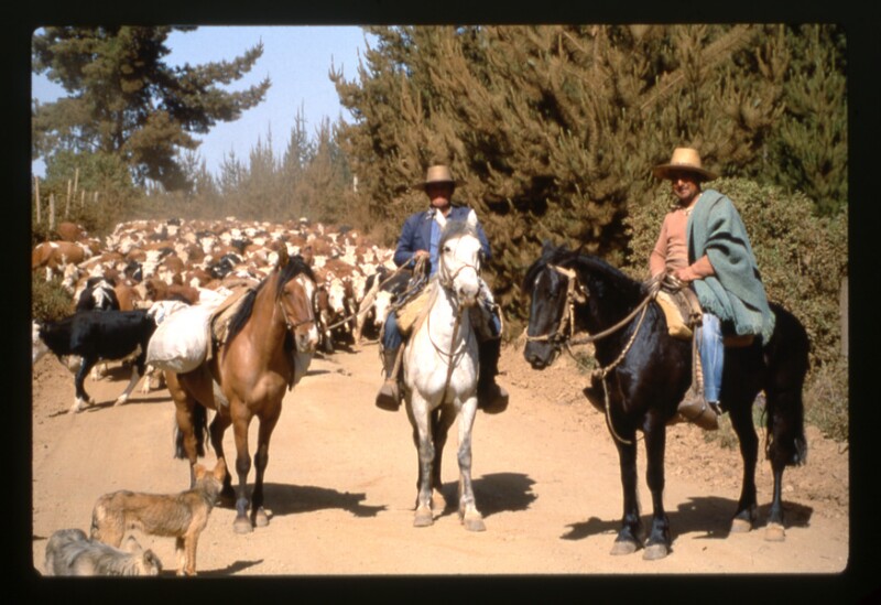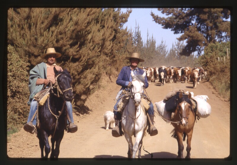 Vichuquén [Dos campesinos a caballo arrean ganado vacuno] [fotografía] Jack Ceitelis.