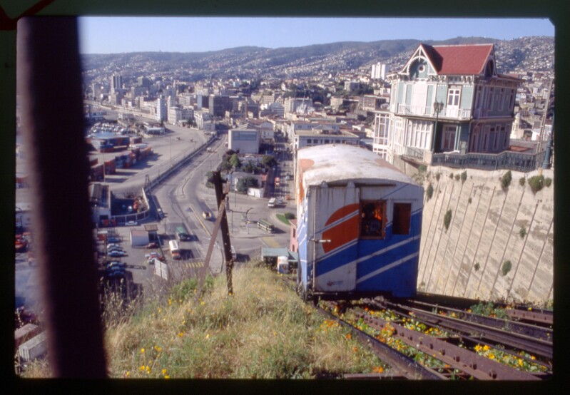 [Vista de paseantes, calle de acceso y línea férrea de ascensor; cerro de Valparaíso] [fotografía] Jack Ceitelis.