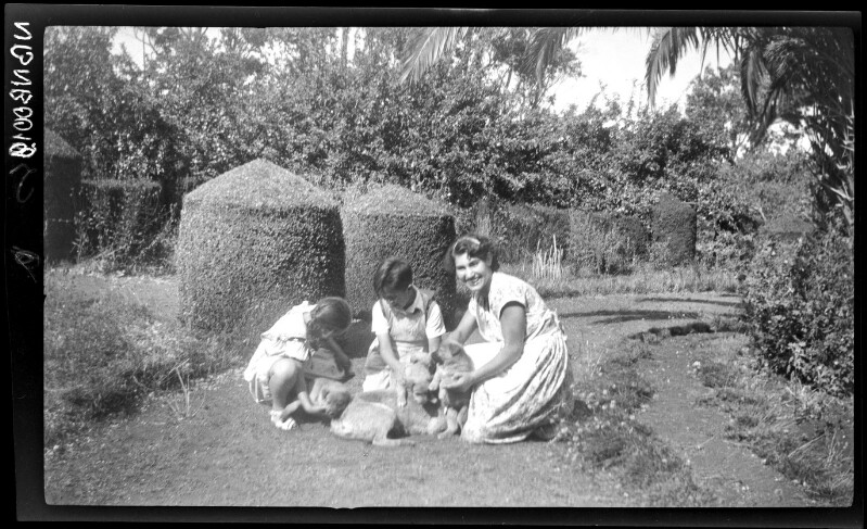 [Mujer junto a dos niños y un grupo de cachorros en la casa de la familia Rivas en Los Carrizos] Benedicto Rivas.