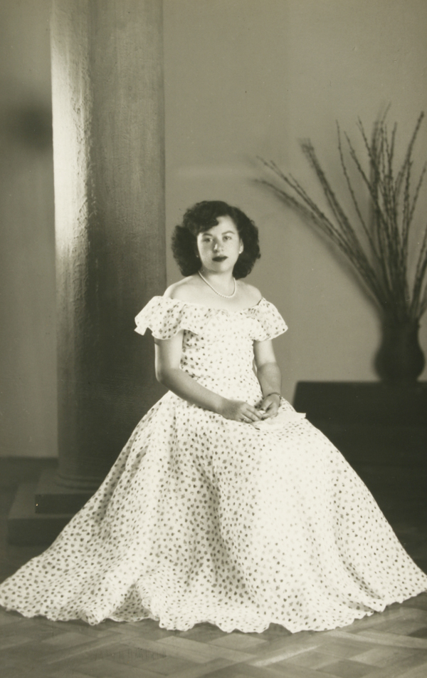 [Retrato de una mujer joven; lleva vestido largo, color pastel] [fotografía] Kyutaro Tunekawa.