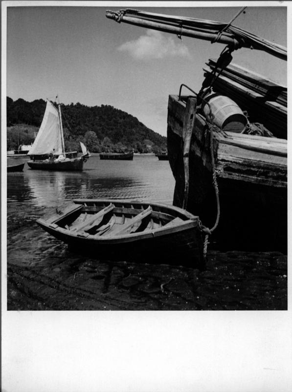 [Carreta tirada por una yunta de bueyes en faenas de descarga de mercadería; lanchas chilotas a orillas de la caleta de Angelmó] [fotografía] Jorge Opazo Galindo.