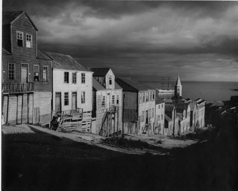[Calle Lota: costado izquierdo, se aprecia la torre de la Iglesia del Colegio María Auxiliadora, construida en 1915; al fondo, la Bahía de Puerto Montt y la Isla Tenglo] [fotografía] Jorge Opazo Galindo.