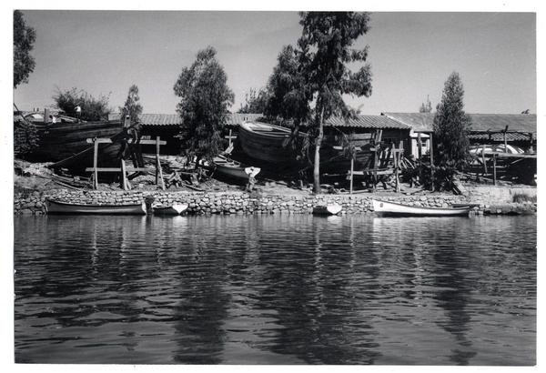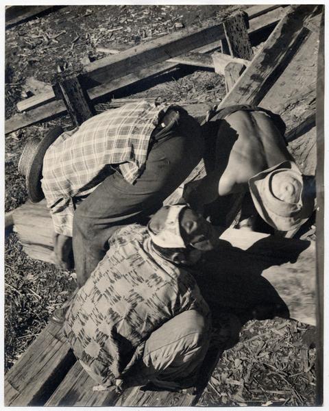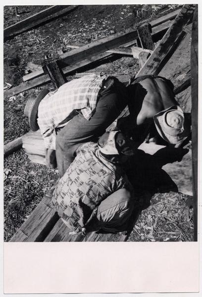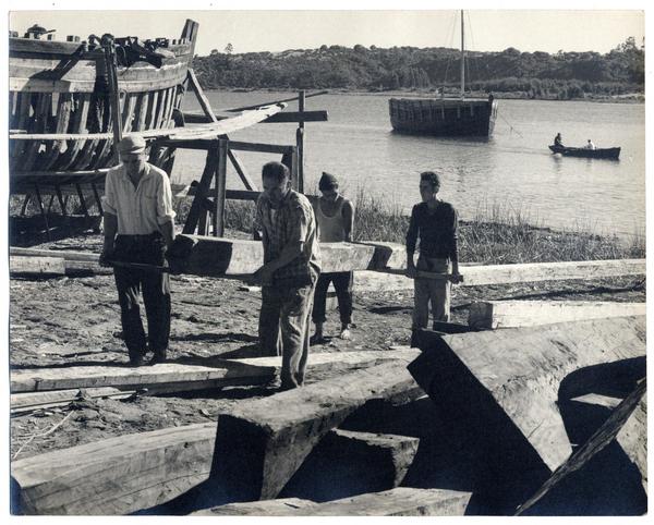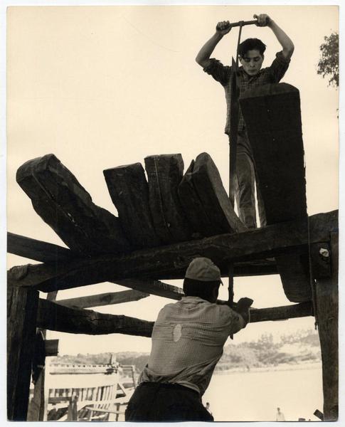 [Trabajadores del Astillero en la ribera del Río Maule] [fotografía] Domingo Ulloa.