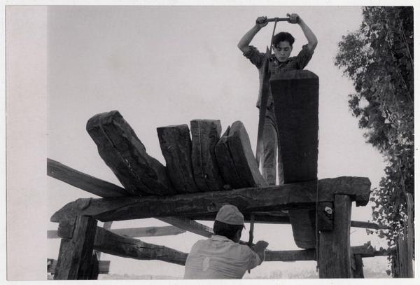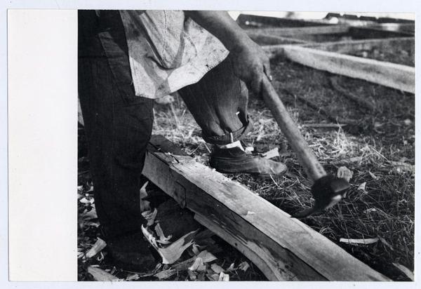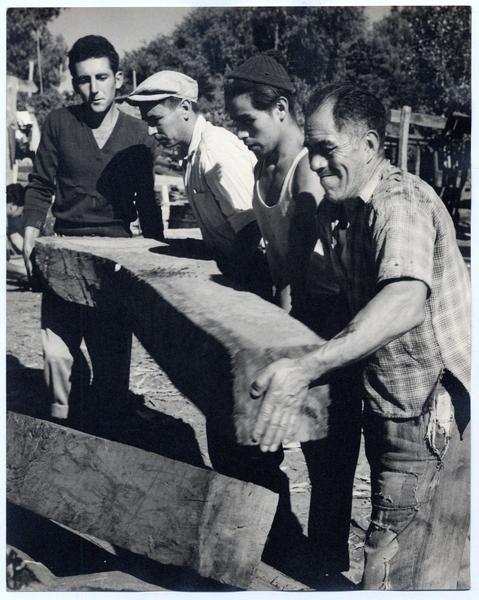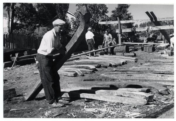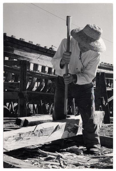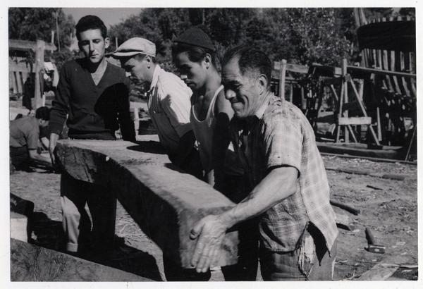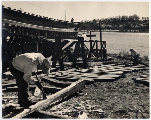 Astilleros del Maule: Aquí trabajan obreros de todas las edades cortando cuadernas [fotografía] Domingo Ulloa.