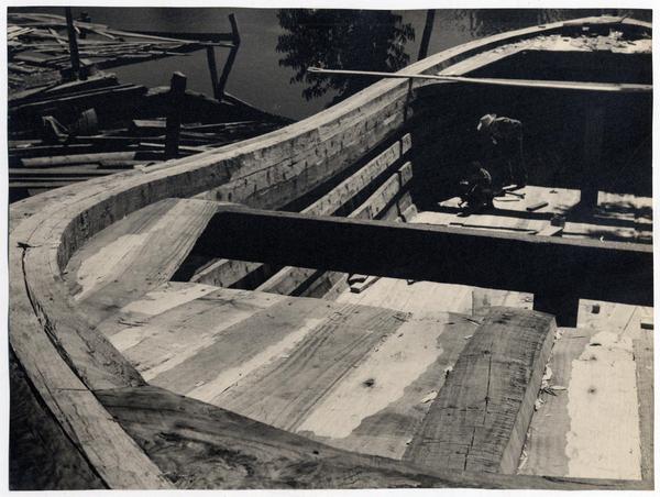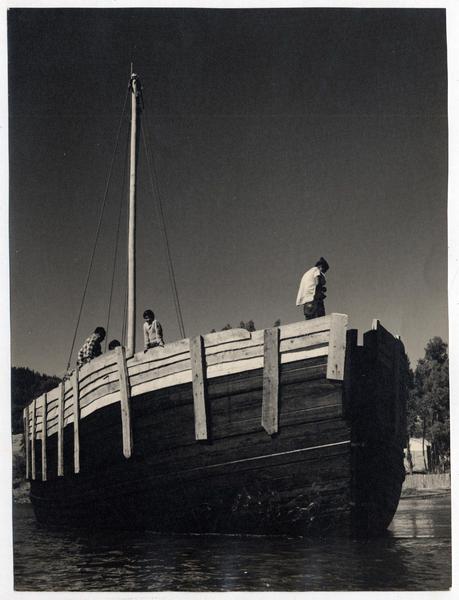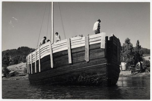 [Trabajadores del astillero a bordo de un falucho en el río Maule] [fotografía] Domingo Ulloa.