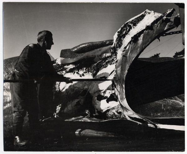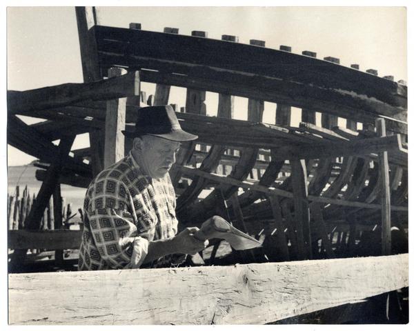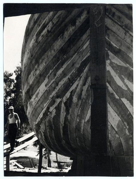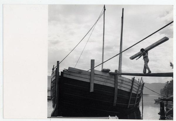 [Trabajador junto a una embarcación] [fotografía] Domingo Ulloa.
