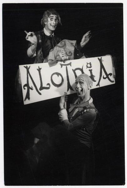 [Afiche del ballet] "Alotria", [sostenido por] Alfonso Unanue [y Joachim Frowin, caracterizados como los tonies de la obra] [fotografía] Domingo Ulloa.