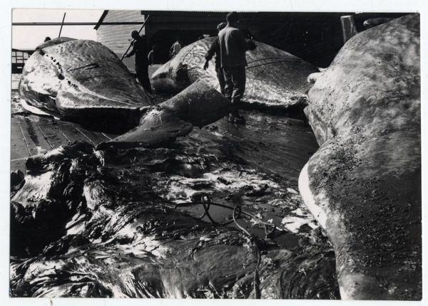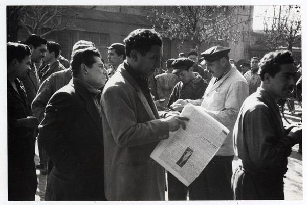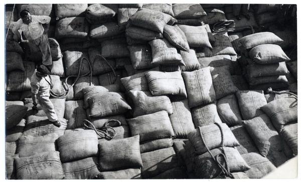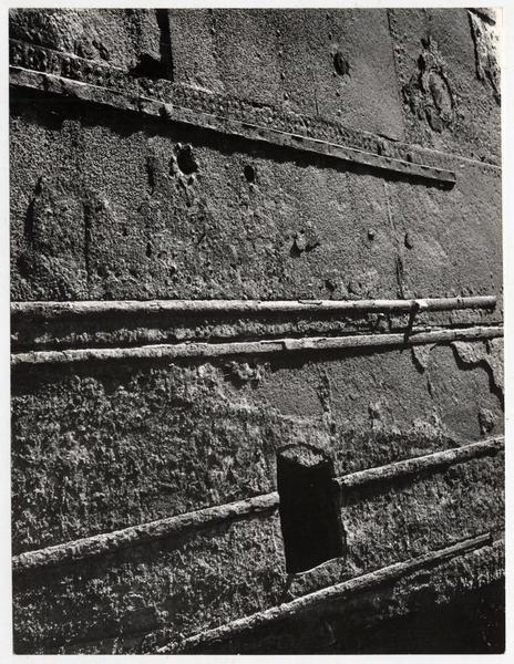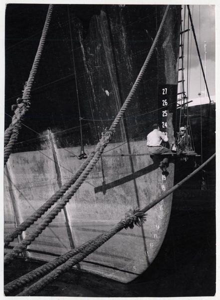 [Trabajadores sobre un andamio, costado del casco de un buque, pintan de blanco los números marcados con cincel, señalan la parte sumergida] [fotografía] Antonio Quintana.