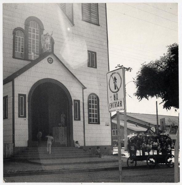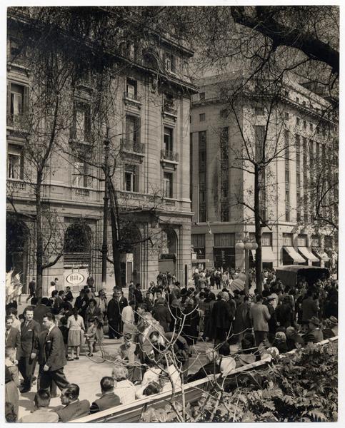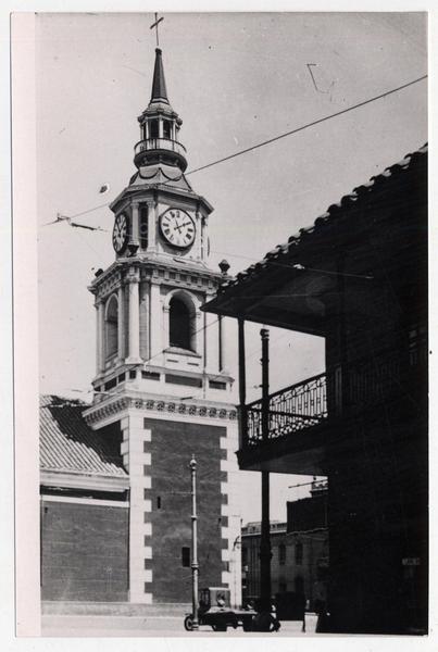 Santiago (Chile : Ciudad) - Tranvías - Avenida Libertador Bernardo O'Higgins (Santiago, Chile) - Pérgolas - Iglesia de San Francisco (Santiago, Chile) - Automóviles antiguos y clásicos - Fotógrafos - Edificios históricos - Arquitectura - Fotografías - Arquitectura religiosa - Historia