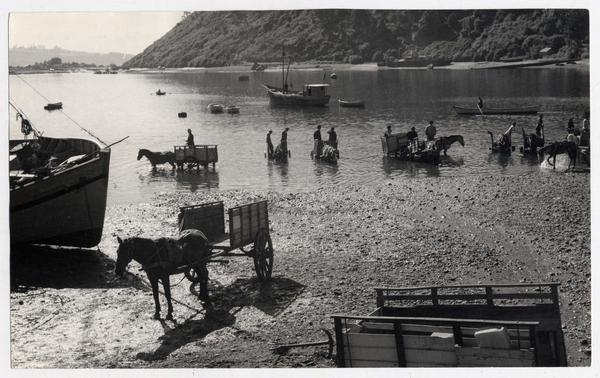 Botadura de un lanchón y se prepara la madera para el siguiente [fotografía] Domingo Ulloa.