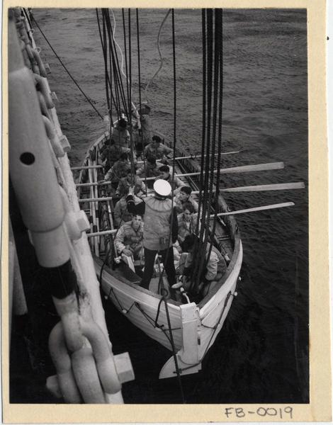 [Tripulación de "La Esmeralda" en un bote, costado del Buque Escuela] [fotografía] Domingo Ulloa.