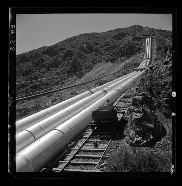 [Vista de cañerías metálicas, conducen el agua de la cámara de carga a la casa de máquinas, descenso casi vertical de 120 m.] [fotografía] Luis Ladrón de Guevara.