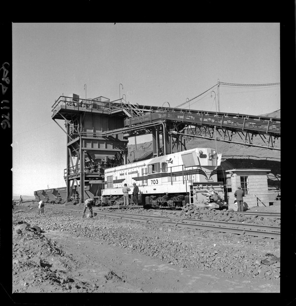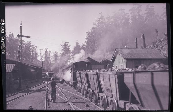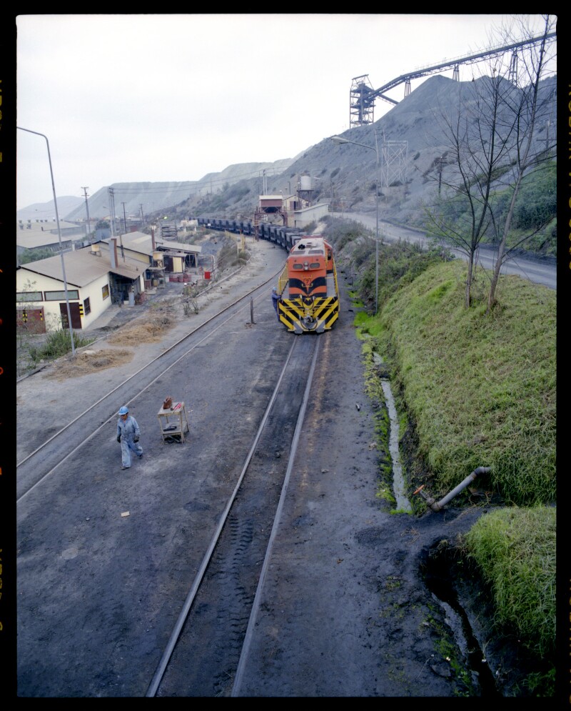 [Transporte del carbón por arrastre en vagones de acarreo por medio de locomotora] [fotografía] Ignacio Hochhäusler.